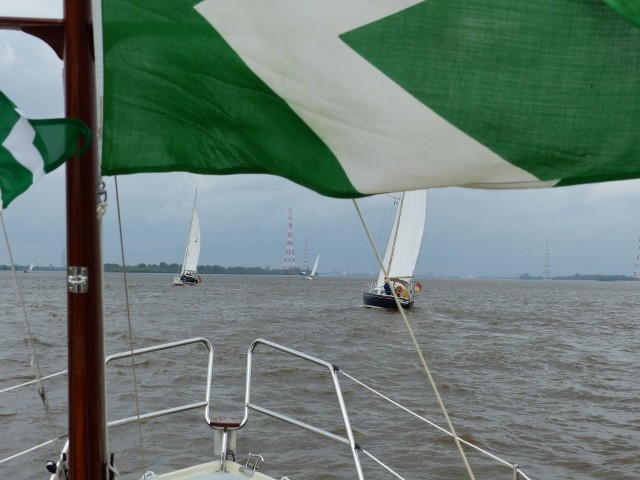 Die Überraschung kam am Sonntag früh.Der starke Wind hatte reichlich Wasser in die Elbmündung gedrückt.In der Folge wurde das Sperrwerk geschlossen, wodurch sich die Rückfahrt verzögerte. Also voll gegen den Ebbstrom.